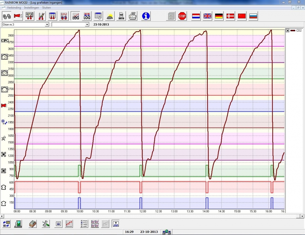 Controlling with the Mooij CO2 sensor results into a better frying color. The CO2 sensor is connected to an input board of the Storage computer and continuously measures the CO2 content in ppm. The CO2 sensor prevents unnecessary refreshing of the air and minimizes the energy costs and the weight and quality losses.